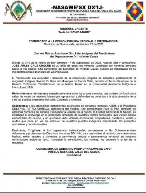 De acuerdo con el comunicado de la consejería de gobierno propio Nasawesx Dxi’j pueblo Nasa del Valle del Cauca, siendo a las 9:40 pm, el 17 de septiembre de 2023, fue asesinado el líder José Arley Cruz Chocue, autoridad tradicional de Kwe’sx Yu Kiwe por hombres armados sobre la vía pública en el sitio del cementerio del municipio de Miranda en el departamento del Cauca.