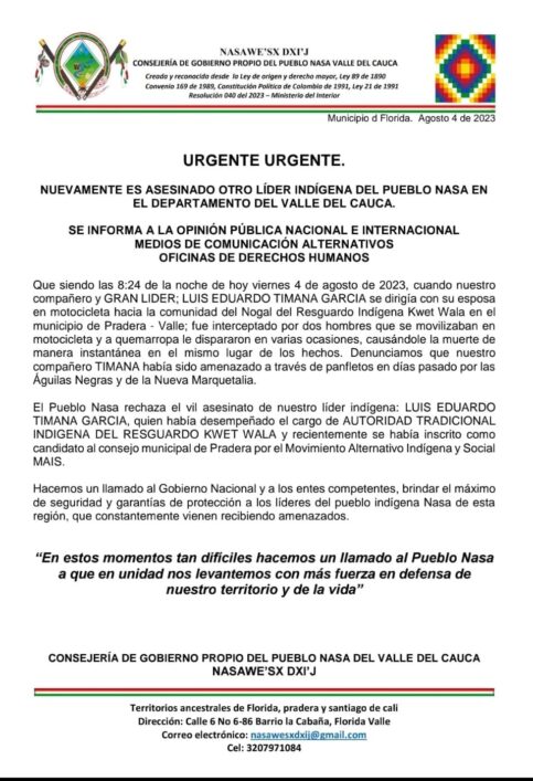 De acuerdo con el comunicado de la Consejería de Gobierno Propio del Pueblo Nasa del Valle del Cauca, el viernes 4 de agosto, siendo las 8:24, fue asesinado Luis Eduardo Timana García, cuando se dirigía junto con su esposa a la comunidad del Nogal resguardo de Kwet Wala en el municipio de Pradera. En el trayecto fue interceptado por dos hombres en motocicleta quienes le disparan en varias ocasiones causándole la muerte. Luis Eduardo había sido amenazado mediante panfletos en días pasados por las Águilas Negras y la Nueva Marquetalia.